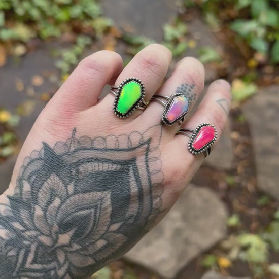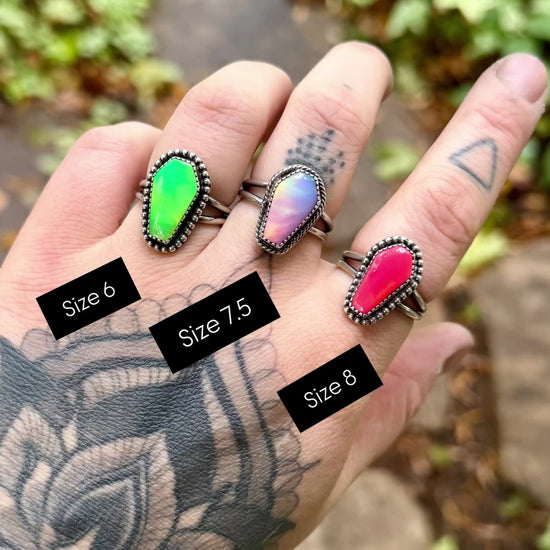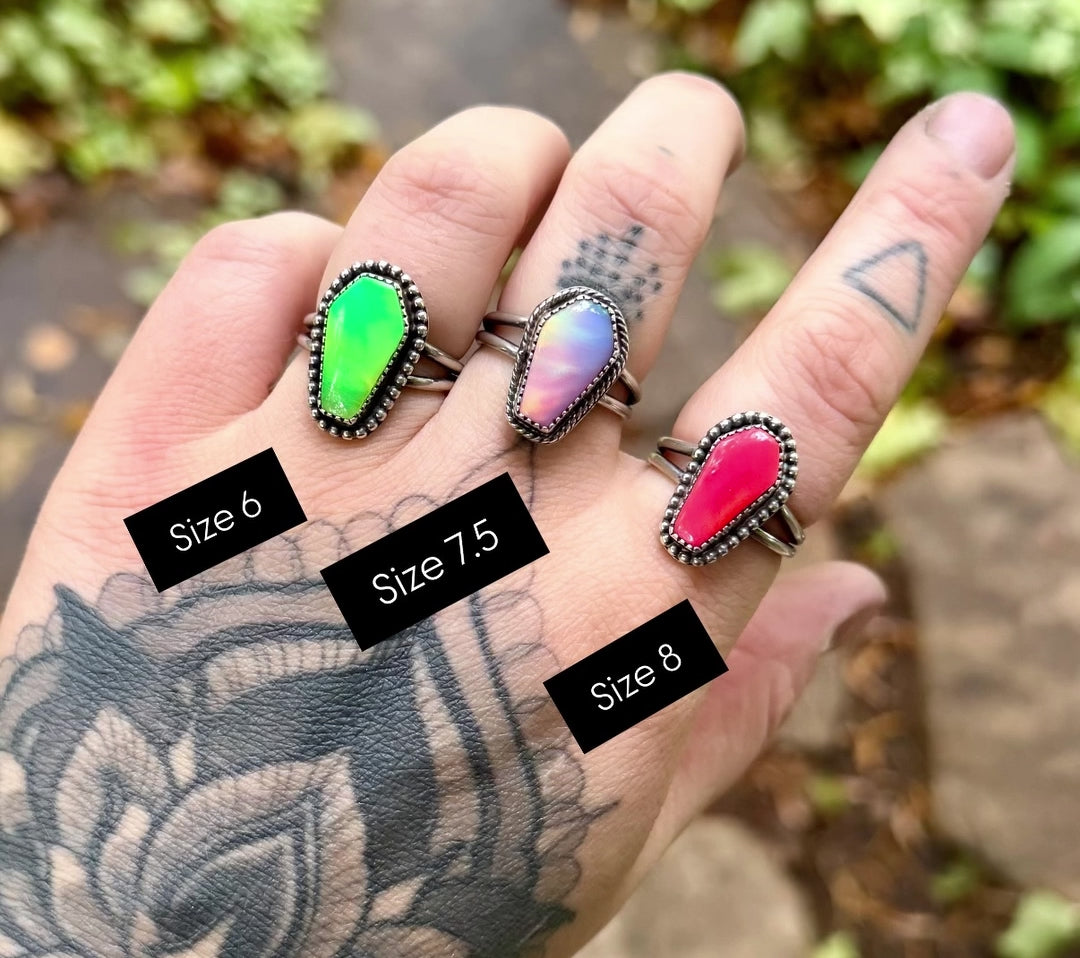 Aurora Opal (lab opal) Coffin Rings . Hand crafted using .999 fine and .925 sterling silver. Limited editions for Halloween 2025.