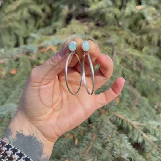 Soft shimmer meets effortless movement in these Australian opal hoop earrings. Each pair features luminous, genuine Australian opals with flashes of blue and green, bezel-set in sterling silver and paired with hand-formed elongated hoop drops. The result is a lightweight, elegant statement that catches the light with every turn of your head.