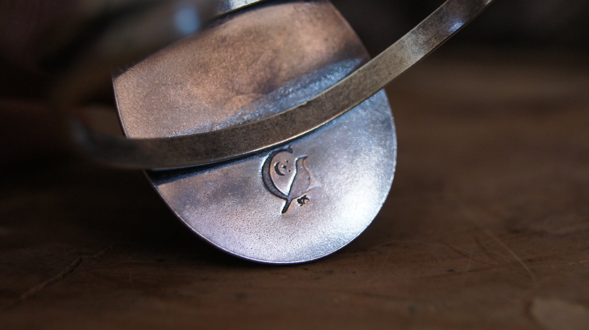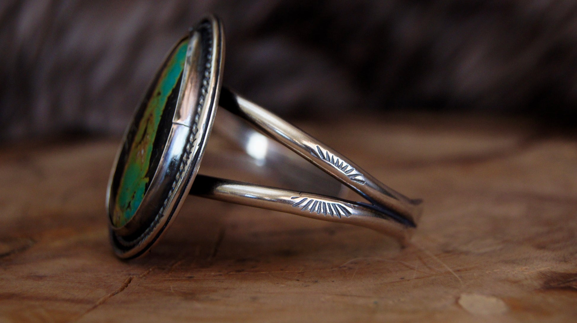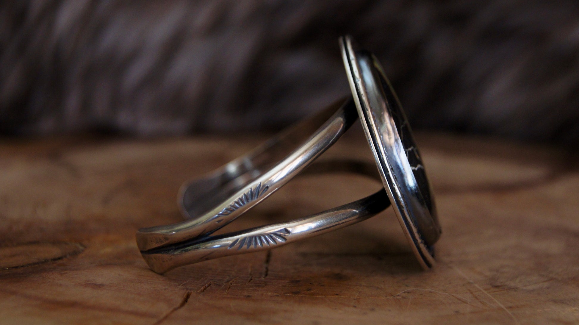 Constructed with two 6g half round wires and 20g sterling silver sheet. Hand stamped and crafted. One of a kind piece with the most stunning chunk of Black Jack Turquoise (High Grade/Nevada Mined).