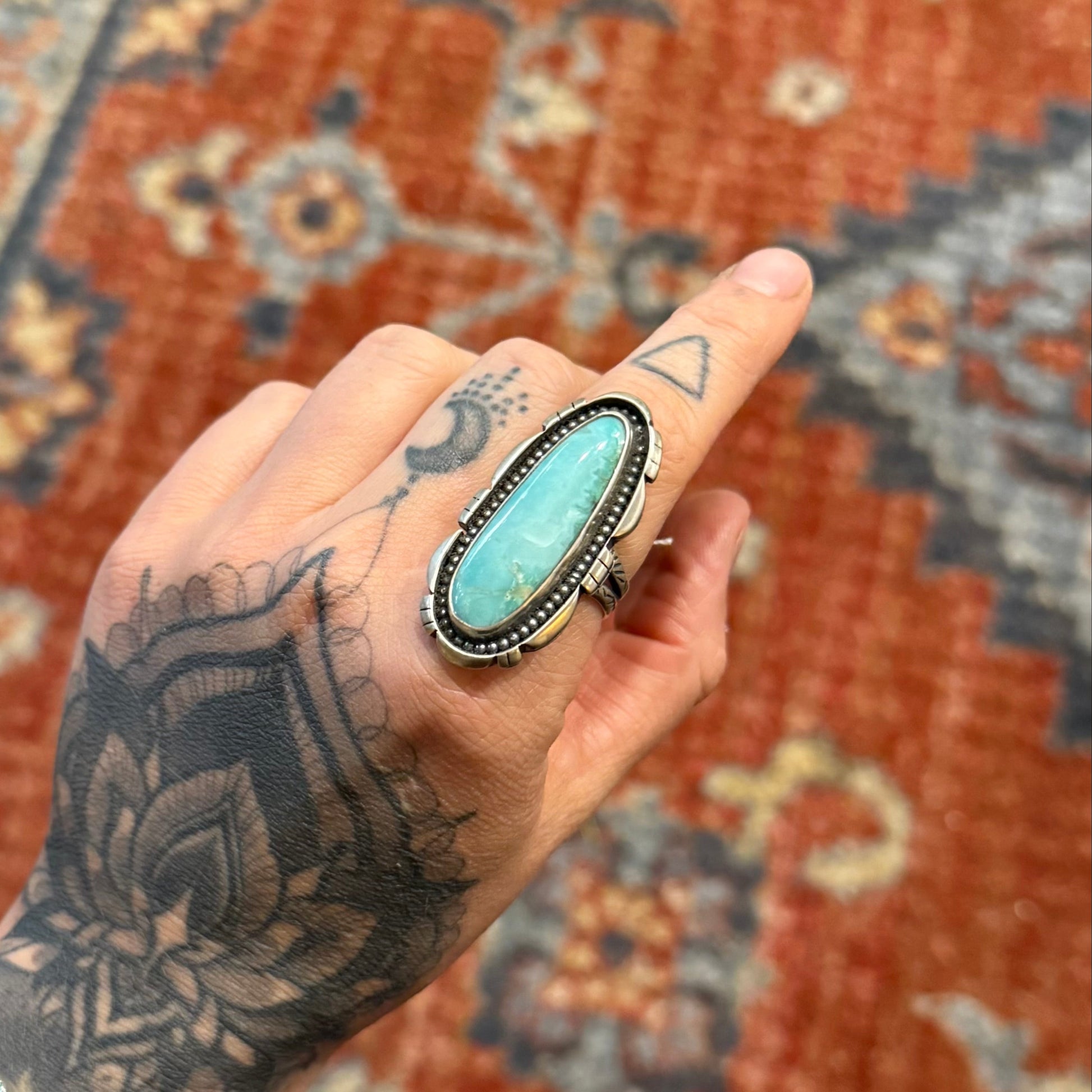 NV mined Variscite set in hand sawed border. Split Ring band with southwest stamping.