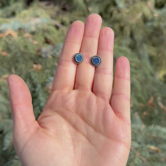 Light-catching and effortlessly cosmic—these sterling silver druzy studs add the perfect hint of sparkle for everyday wear. Each pair features shimmering druzy cabochons with natural crystal texture that glitters from every angle, set in smooth sterling bezels for a clean, modern finish.