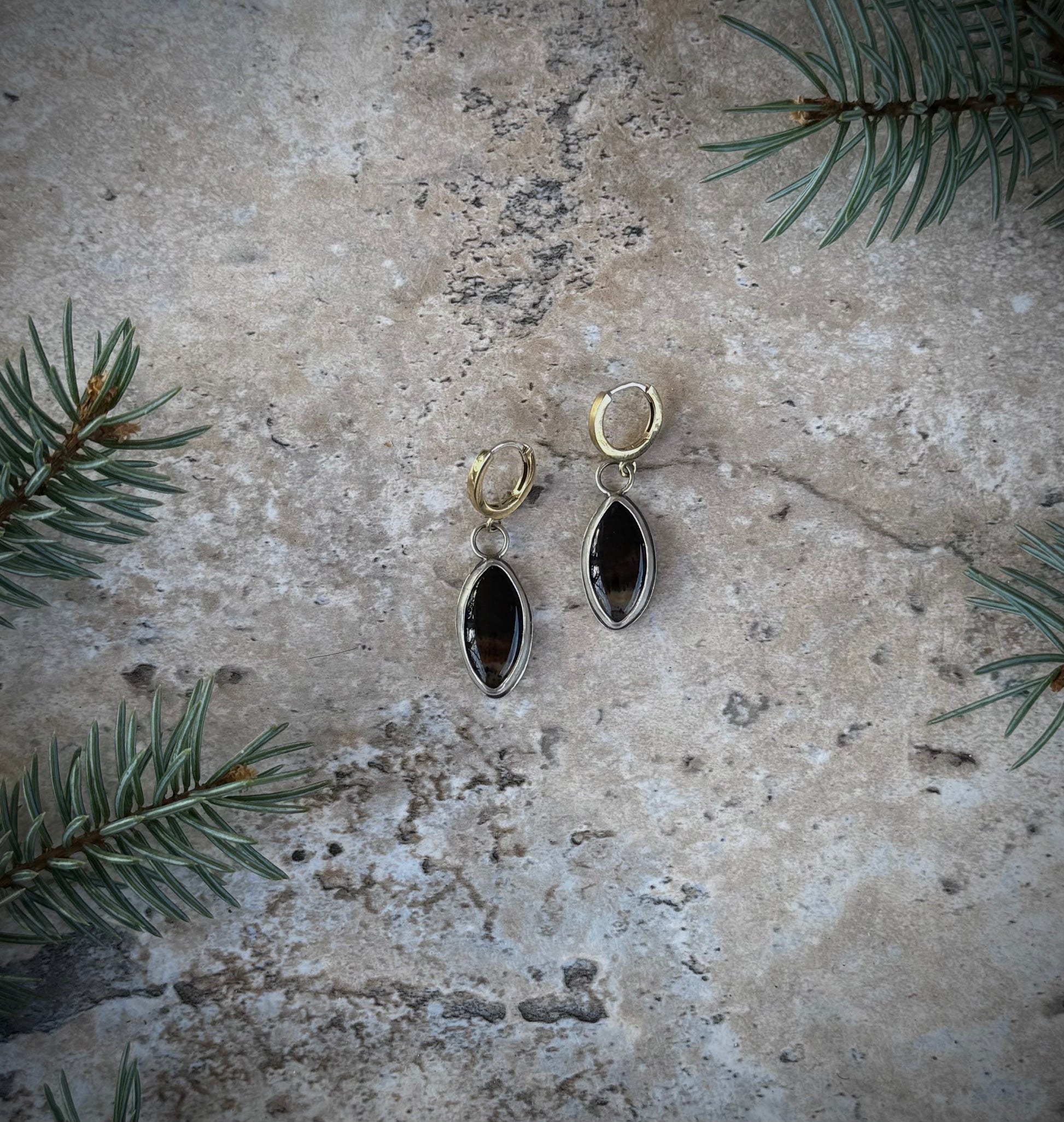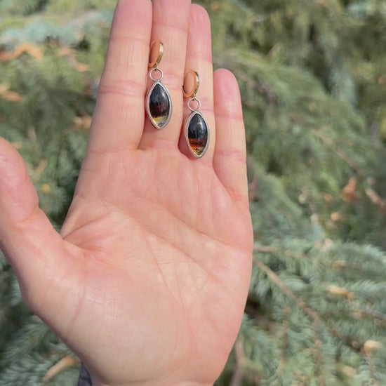 Grounded, warm, and effortlessly celestial—these mixed-metal huggie hoops feature marquise-cut Montana agates set in sterling silver bezels and hung from polished bronze hoops. Each stone displays organic banding in deep caramel, smoke, and golden tones, reminiscent of desert sunsets and ancient earth formations.