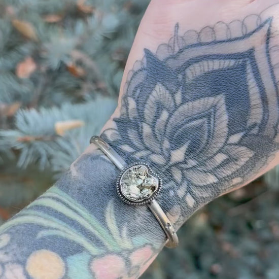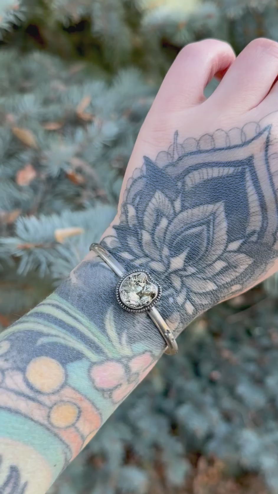 A bold, grounding statement piece crafted entirely by hand. This sterling silver cuff features a raw pyrite centerpiece—known for its earthy shimmer and protective energy—set into a clean, substantial band formed from 6g half-round sterling silver wire.
