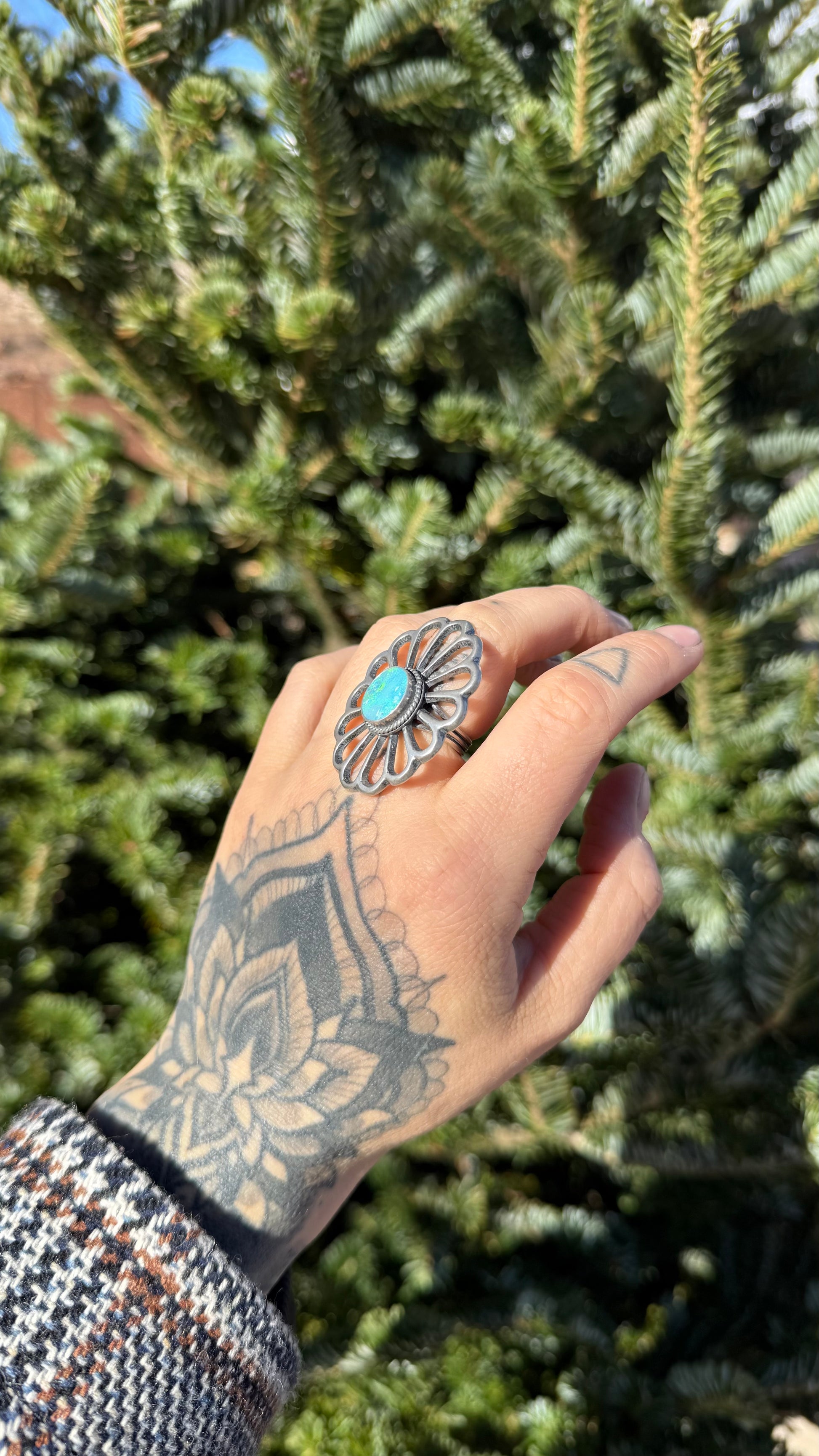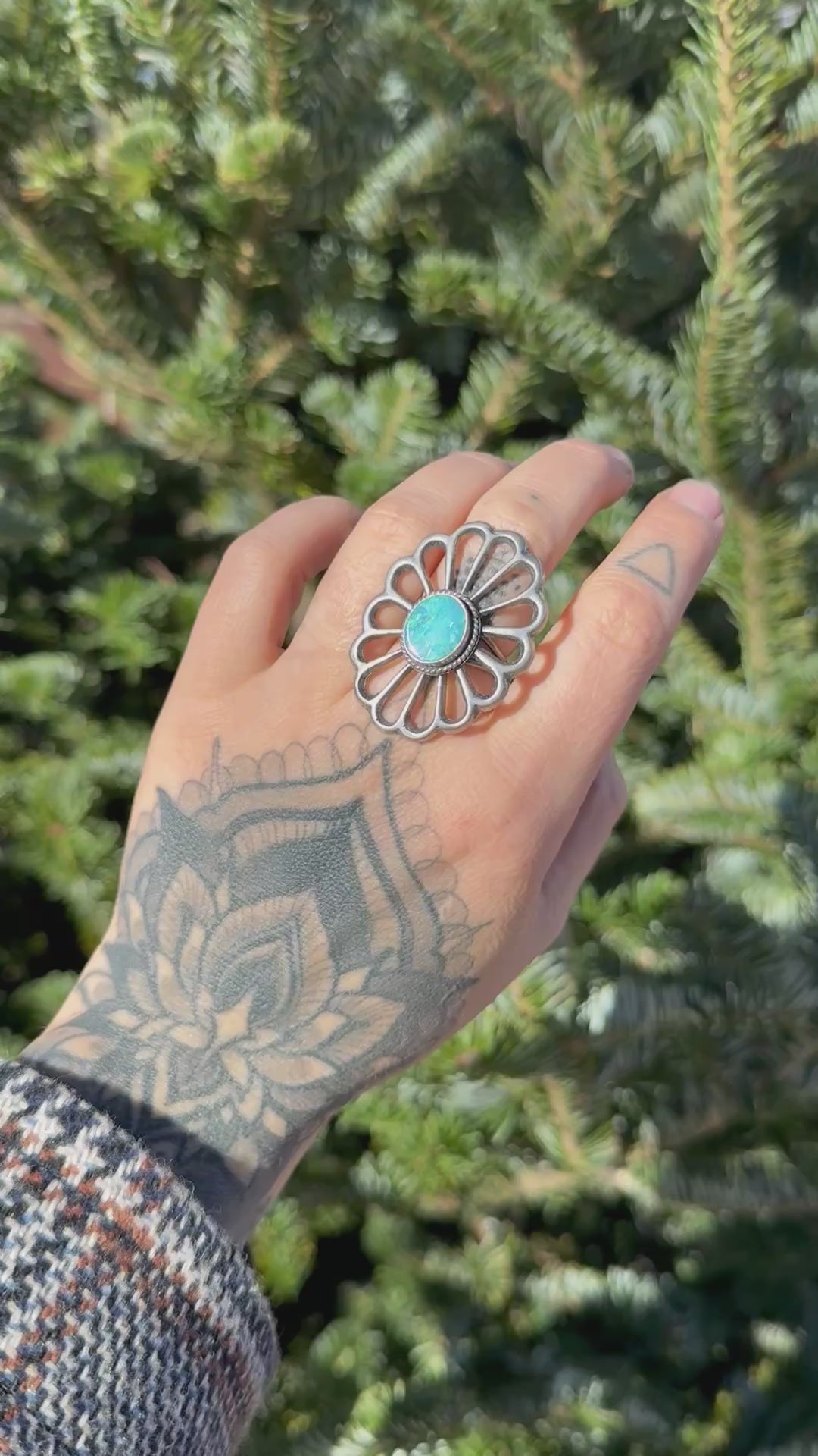 This bold statement ring features a vibrant Coober Pedy opal with electric blue and green flash, set in a hand-crafted sterling silver bezel and framed by an openwork sunburst silhouette. The oxidized finish adds depth and dimension, highlighting the stone’s natural fire while giving the piece a timeless, heirloom feel.