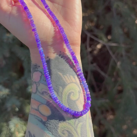 A true heavy hitter. This 16” strand features saturated cosmic purple opal beads with deep violet tones and subtle flashes that glow beautifully in natural light. Bold yet refined, this necklace stands on its own or layers effortlessly with silver or gold accents.