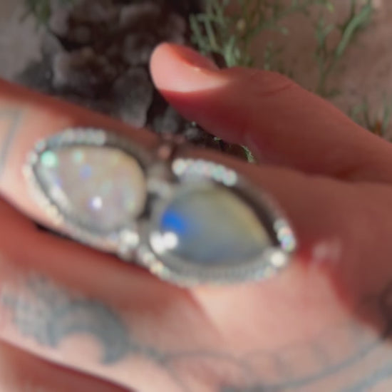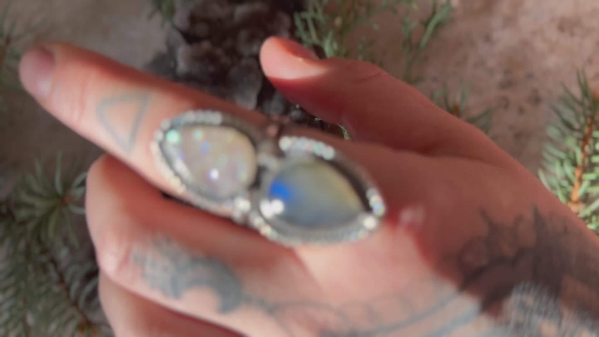 This one-of-a-kind Labradorite and Druzy Ring features a glowing teardrop labradorite paired with a high-sparkle white druzy. Handcrafted in sterling silver with detailed beaded accents, this bold statement ring brings celestial shine and earthy magic together in one piece.