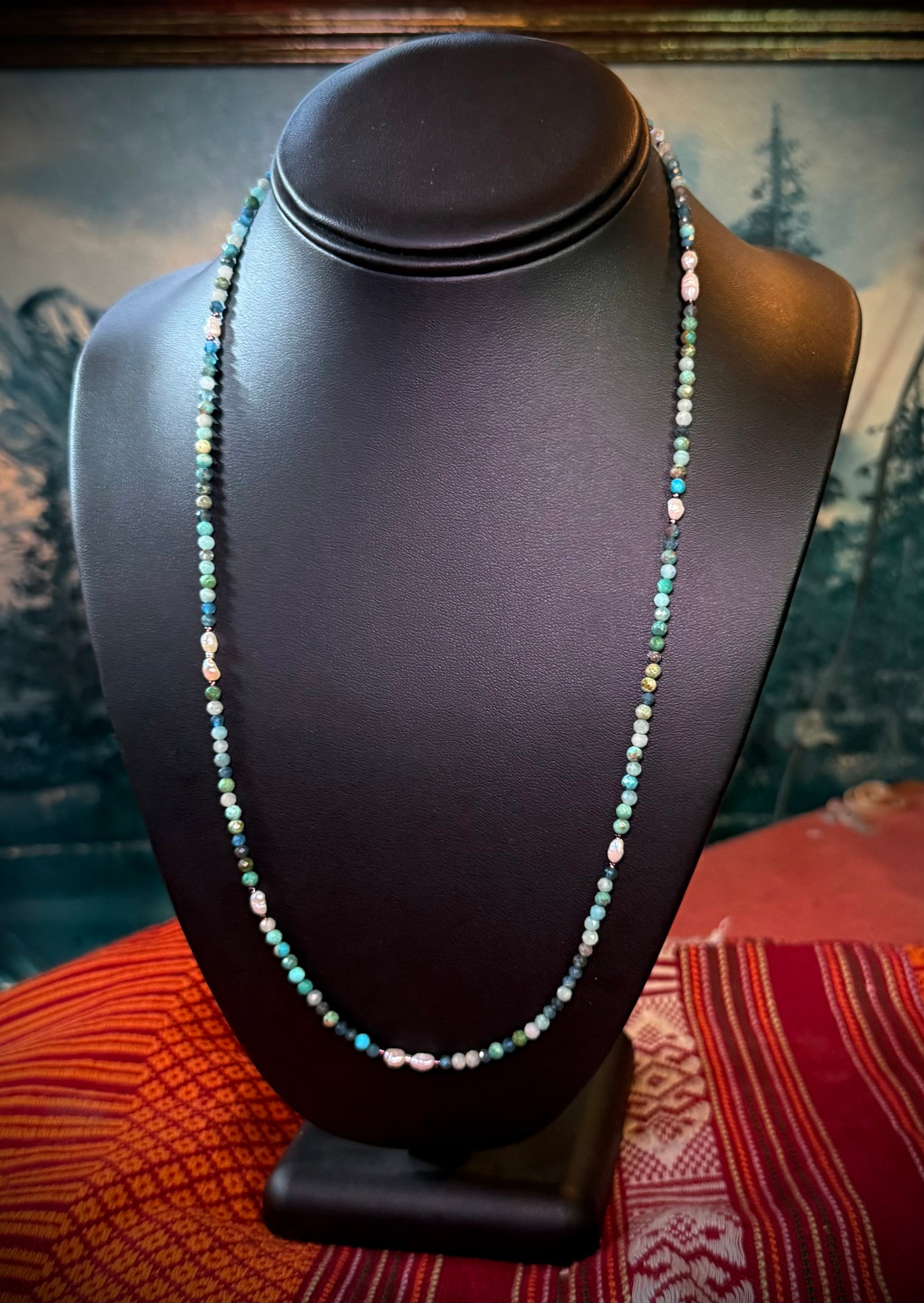 A dreamy mix of faceted stones (apatite, Chrysocolla, African jasper), Freshwater Pearl, and Glass seed beads . .925 clasp & findings . Always handmade.