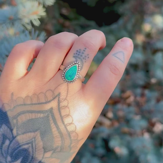 Set in solid .925 sterling silver, the teardrop-shaped opal is framed with a delicate beaded bezel that adds subtle texture while allowing the stone to remain the focal point. The result is a ring that feels light, celestial, and effortlessly wearable.