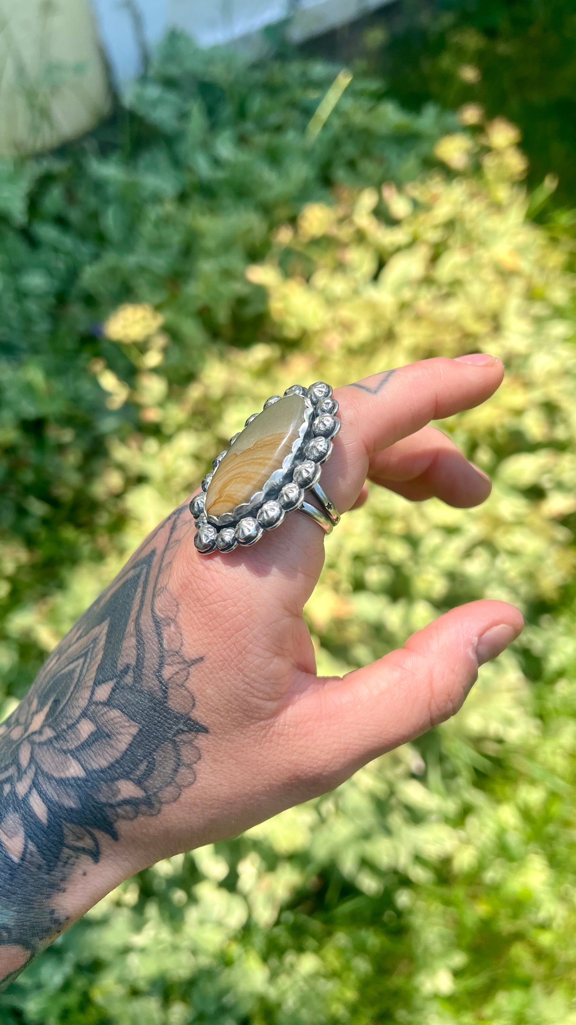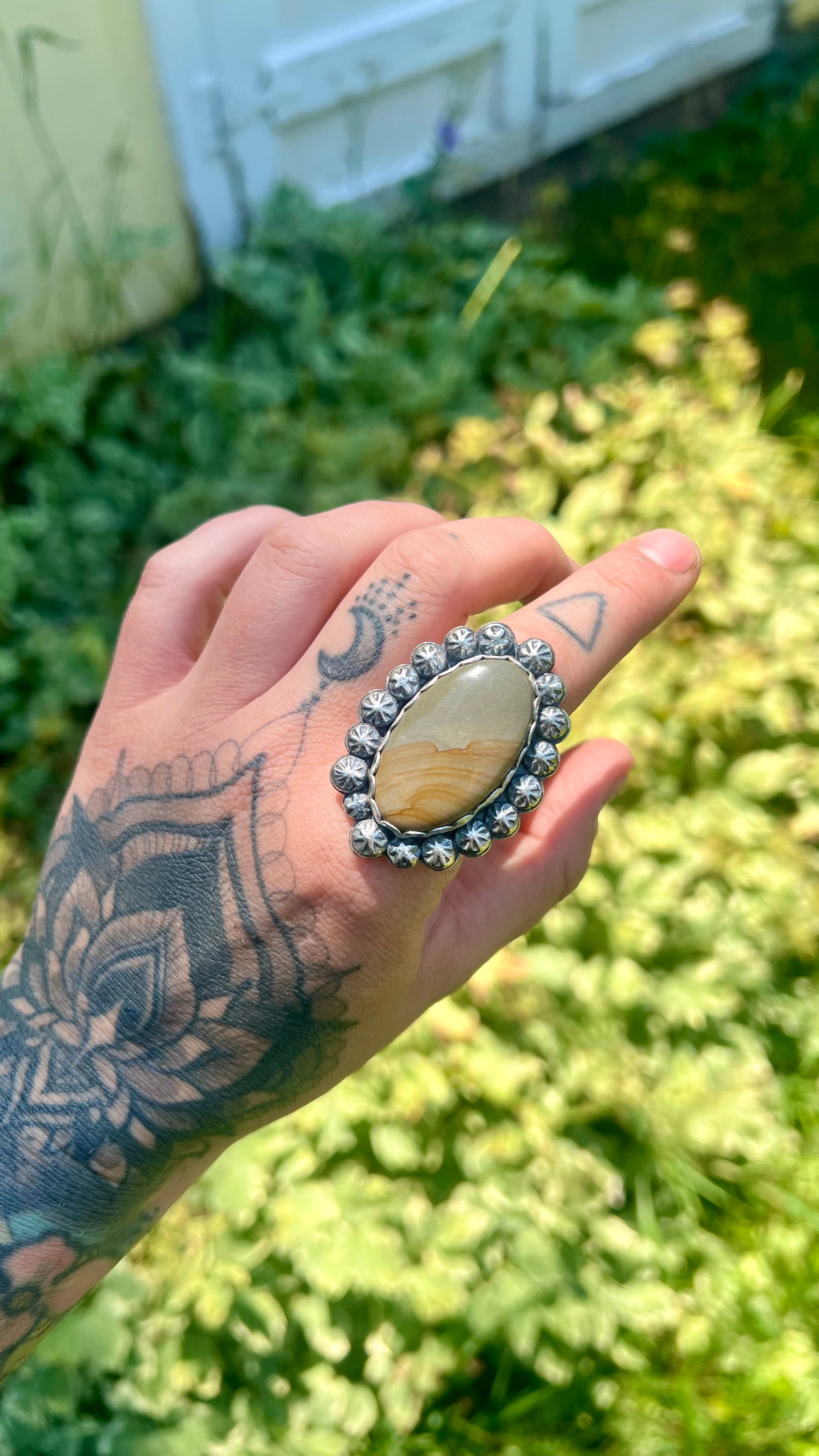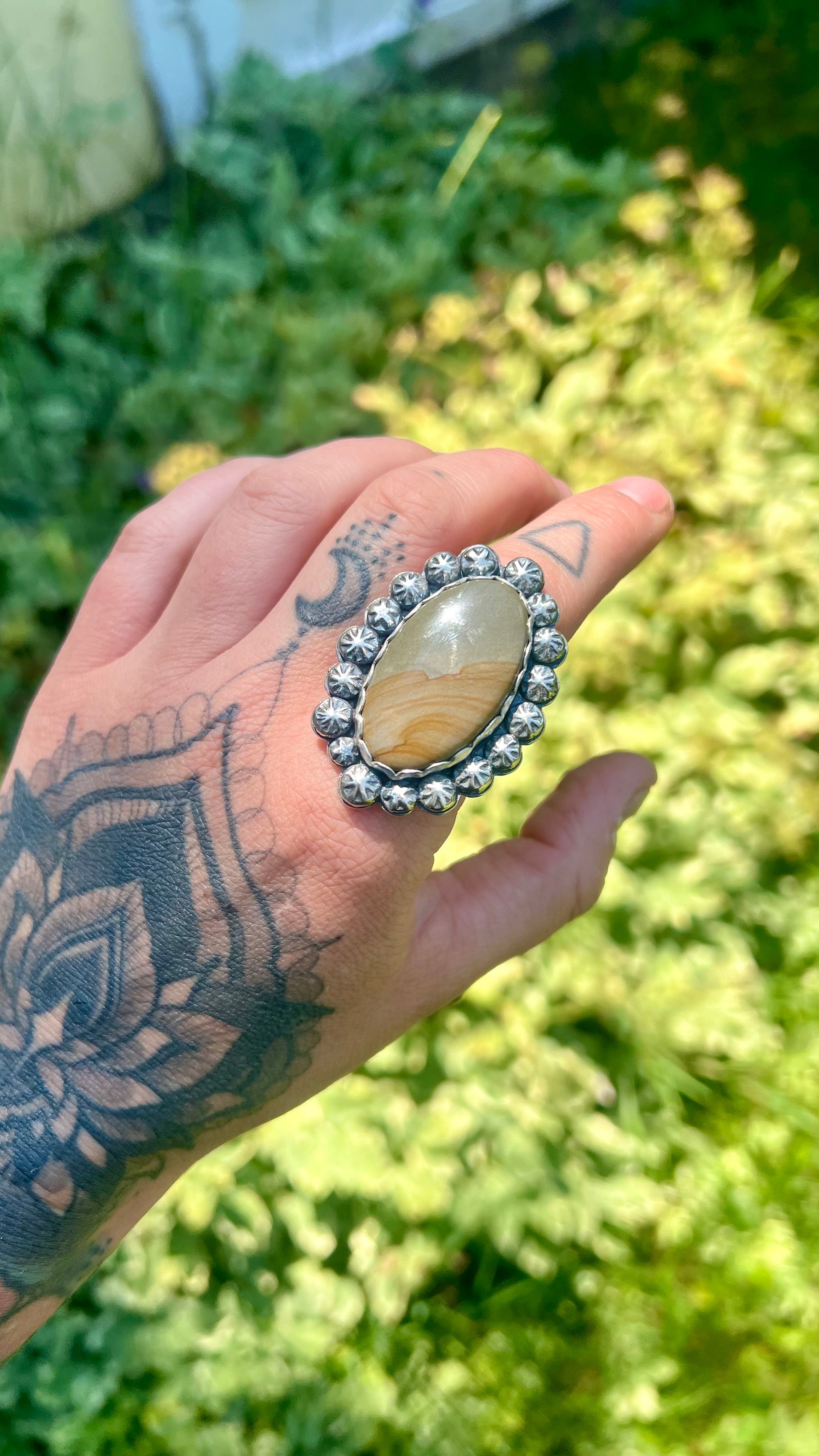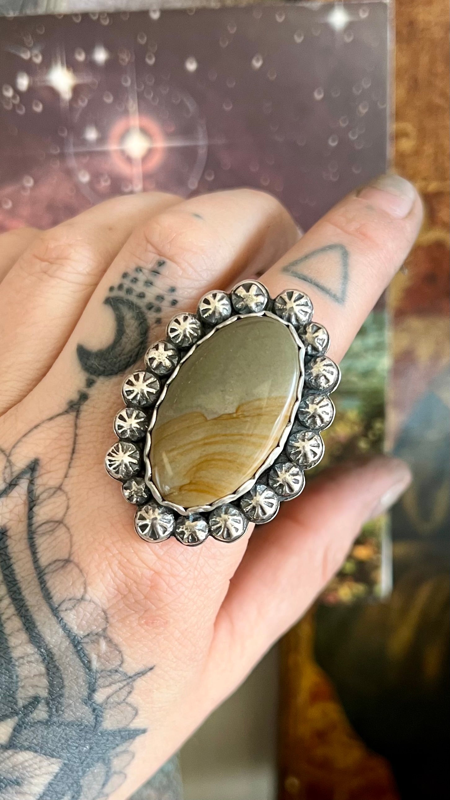 One heck of a statement! All natural picture Jasper (looks like a desert landscape to me) with hand forged celestial details. Split shank ring band.