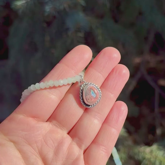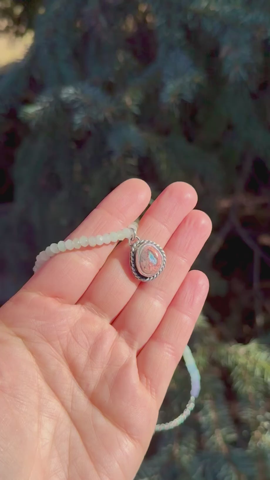 This handcrafted necklace features smooth quartzite beads with a gentle, milky glow that catches the light beautifully against the skin. At the center hangs a hand-crafted Mexican fire opal charm, made by me in sterling silver and chosen for its exceptional flash—alive with warm fire and movement when it hits the sun.