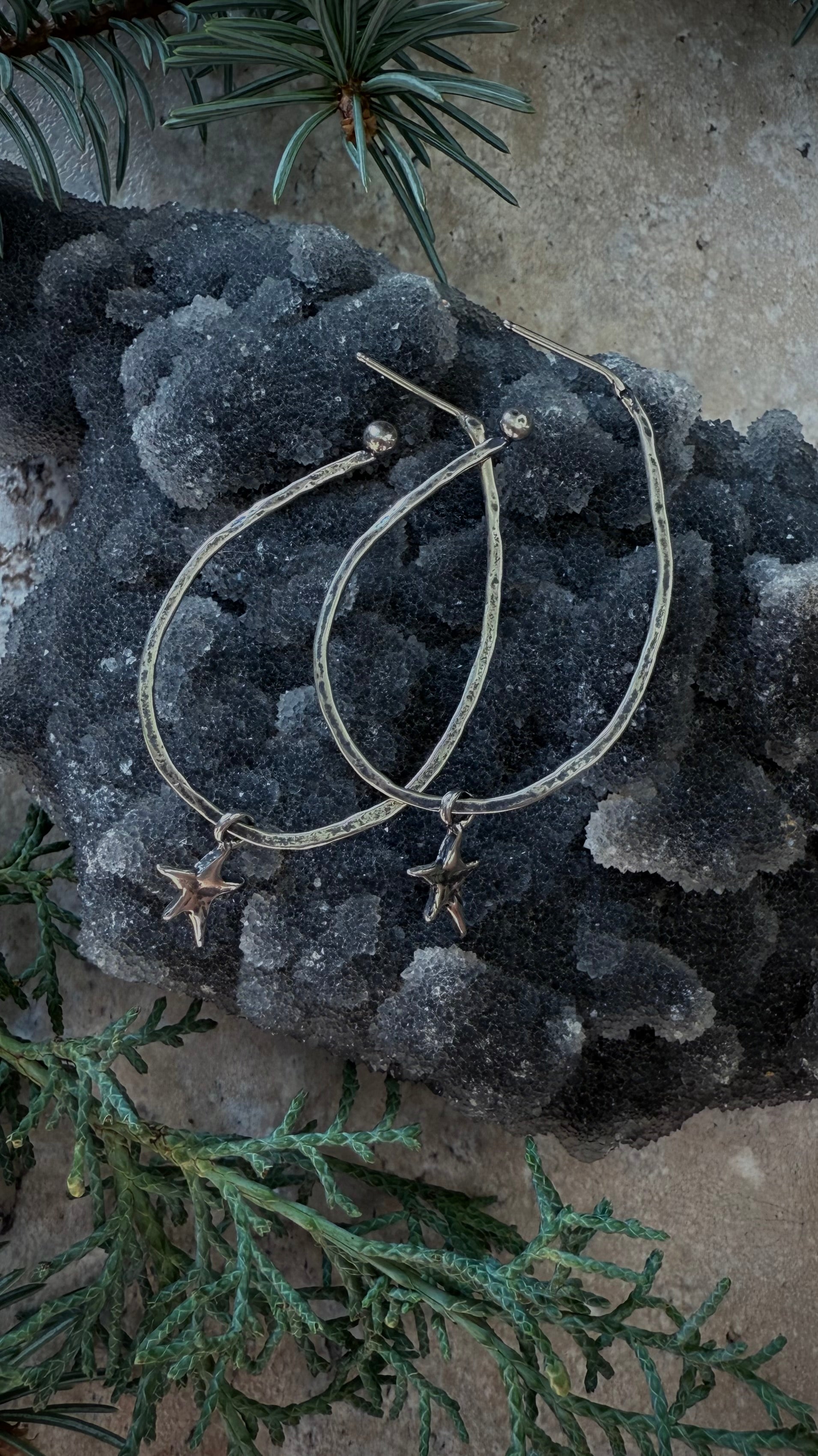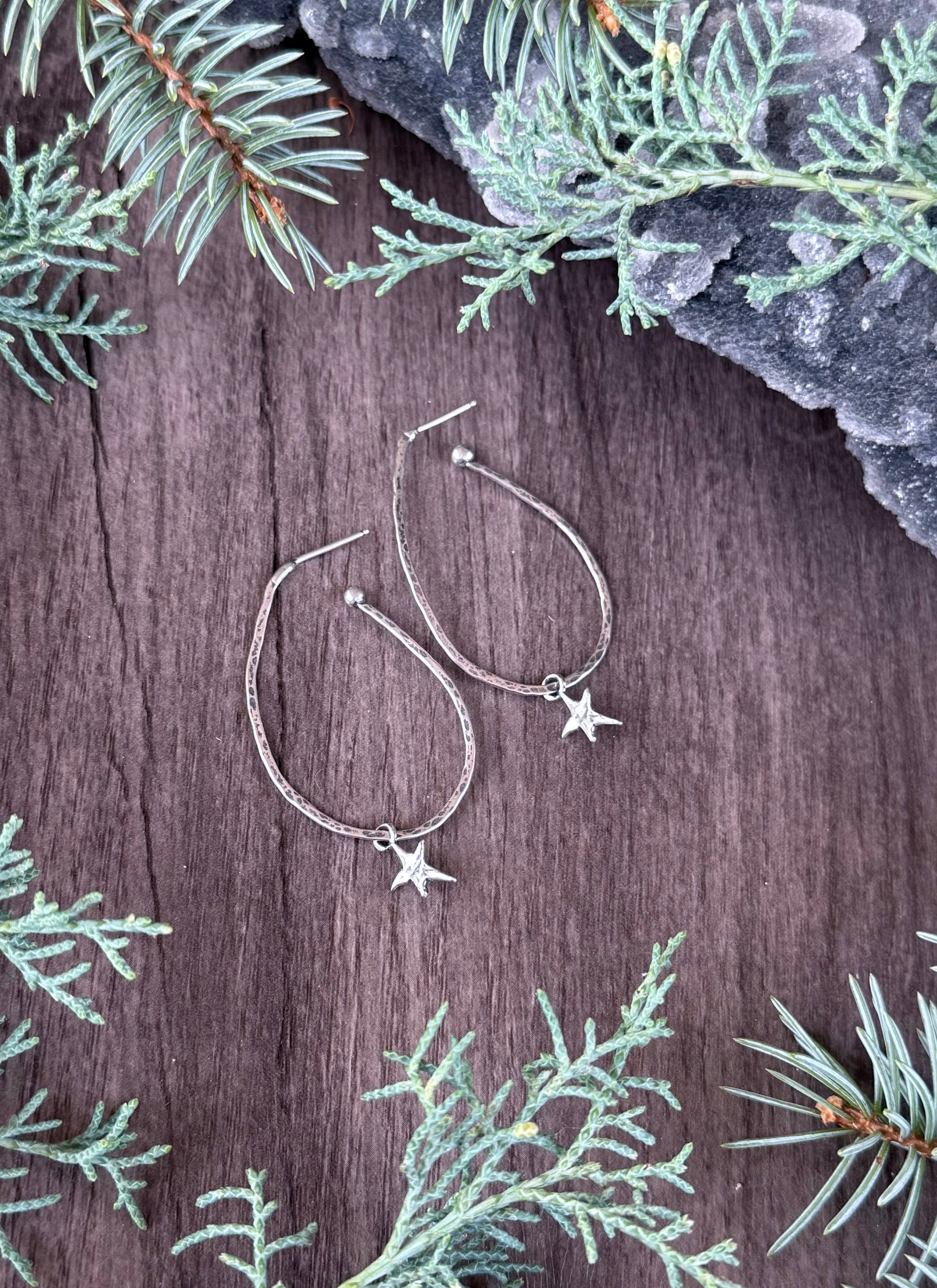 Hand-crafted from solid .925 sterling silver, the Starlit Hoop Earrings feature organically shaped hammered hoops with a tiny silver star charm dancing at the bottom. Lightweight with subtle texture, they catch the light beautifully and offer effortless, everyday celestial vibes.