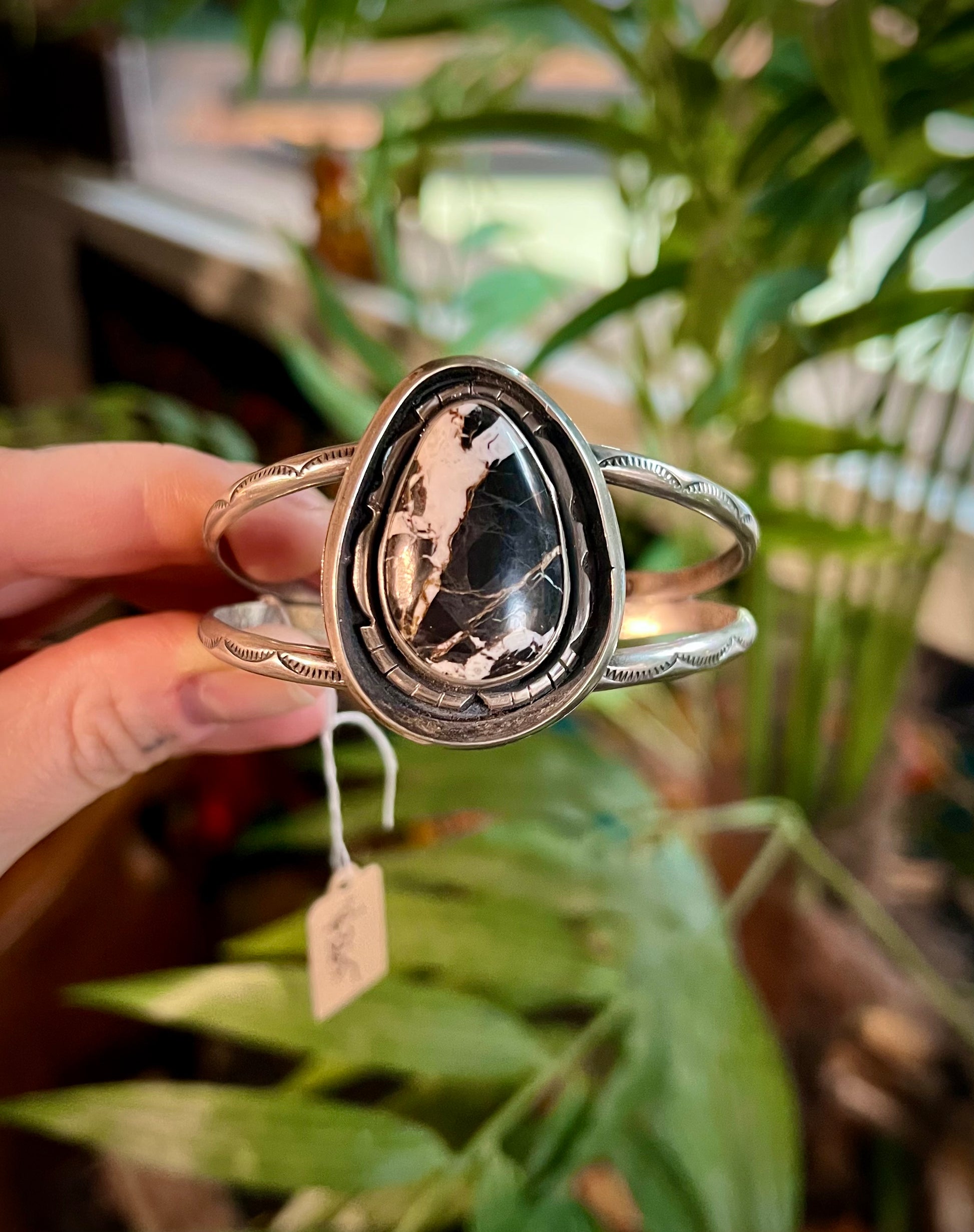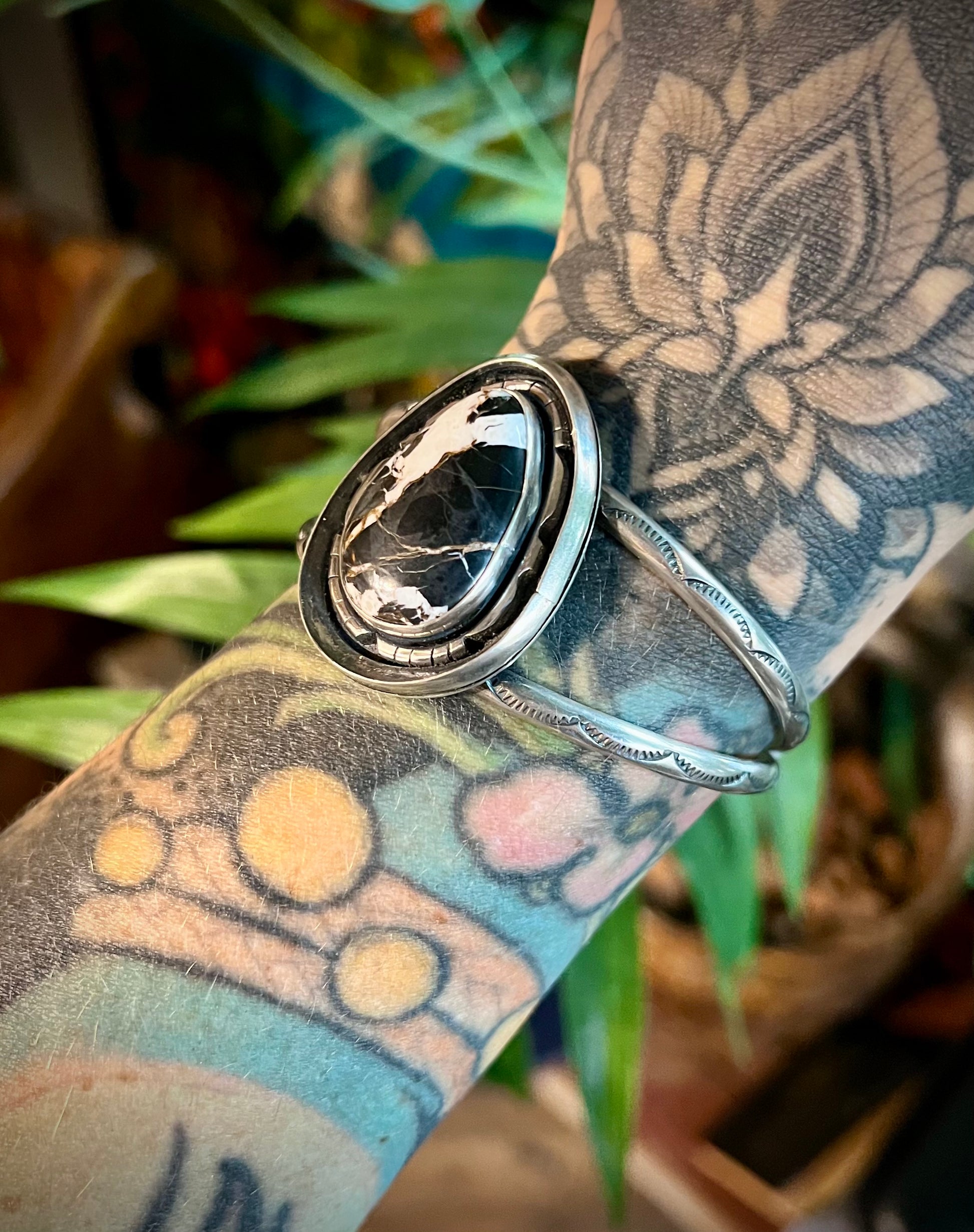All natural White Buffalo set in .999 fine and .925 sterling silver. Crafted from two 6g half round wires and features a saw cut border in a shadow box type setting. Everything is crafted and stamped by hand.