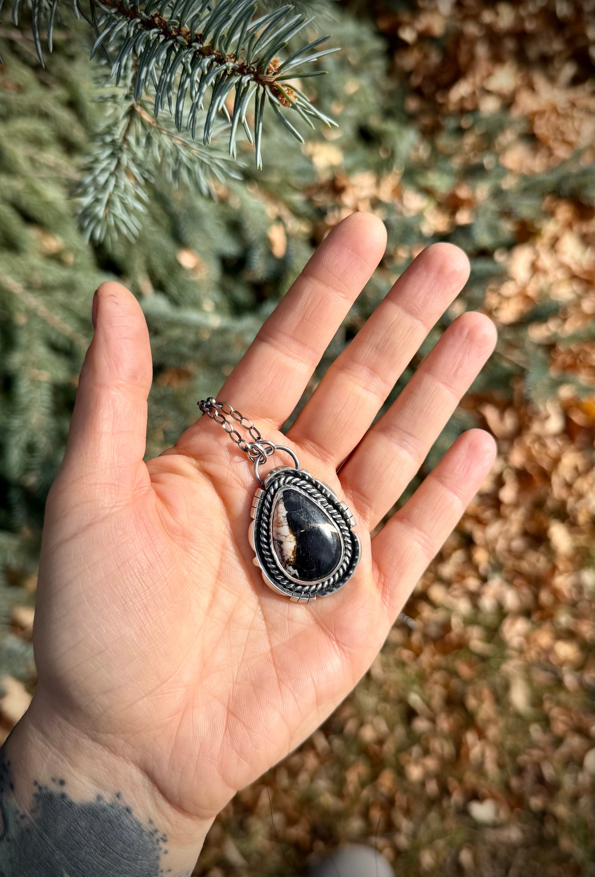 This bold, one-of-a-kind White Buffalo pendant is handcrafted in solid sterling silver and built to last a lifetime. Featuring a high-contrast teardrop stone with natural ivory veining, this piece carries weight—literally and energetically.